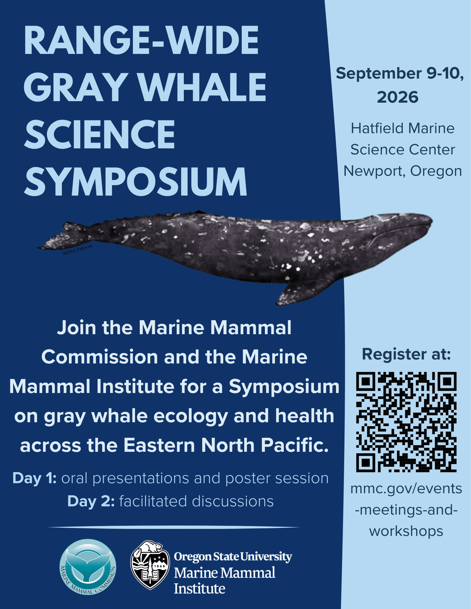 A range-wide Gray Whale Science Symposium will take place on September 9–10, 2026, coordinated by the Marine Mammal Commission and hosted by the Marine Mammal Institute at Oregon State University in Newport, Oregon. This two-day scientific meeting will focus on gray whale ecology and health across the Eastern North Pacific (ENP) and Arctic and will synthesize current research and observations to improve understanding of recent trends in health, feeding behavior, distribution, and population dynamics, and to identify priorities for future research, monitoring, and coordination.