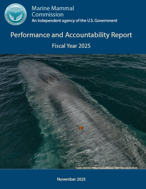 The Office of Management and Budget (OMB) requires that federal agencies submit a report detailing their financial and program performance results for the prior fiscal year. The Performance and Accountability Report is one of several publications that the Marine Mammal Commission releases on an annual basis to highlight our work and the most pressing issues impacting marine mammals and their environment.