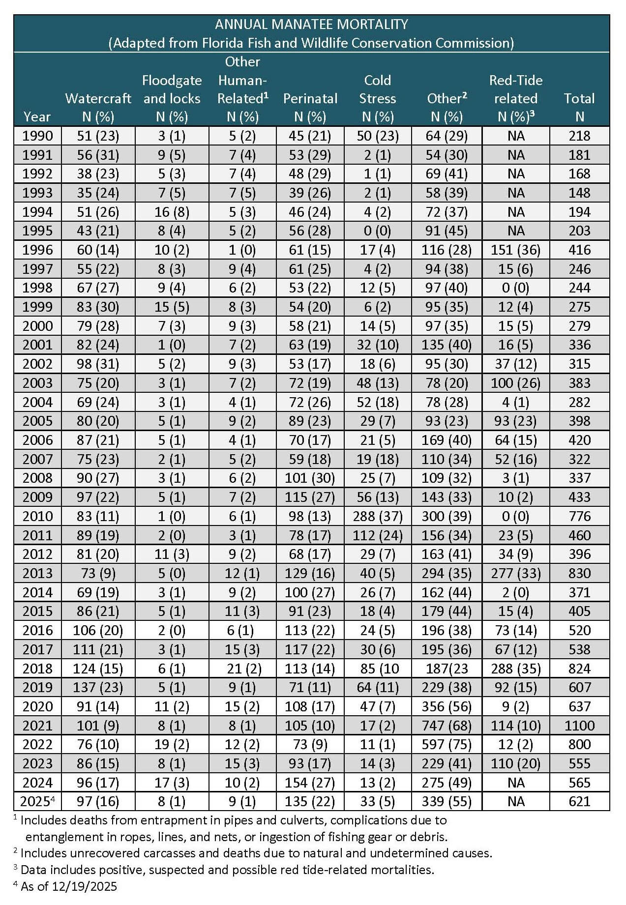 Annual Florida manatee mortality from 1990 to 2025. Annual number and percentage (in parentheses) of known Florida manatee deaths in the southeastern United States (excluding Puerto Rico).