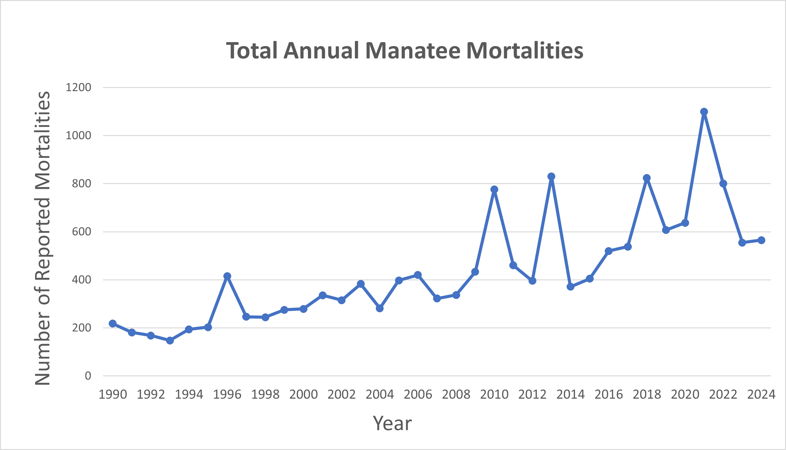 Total number of reported manatee mortalities, 1990 to 2024.