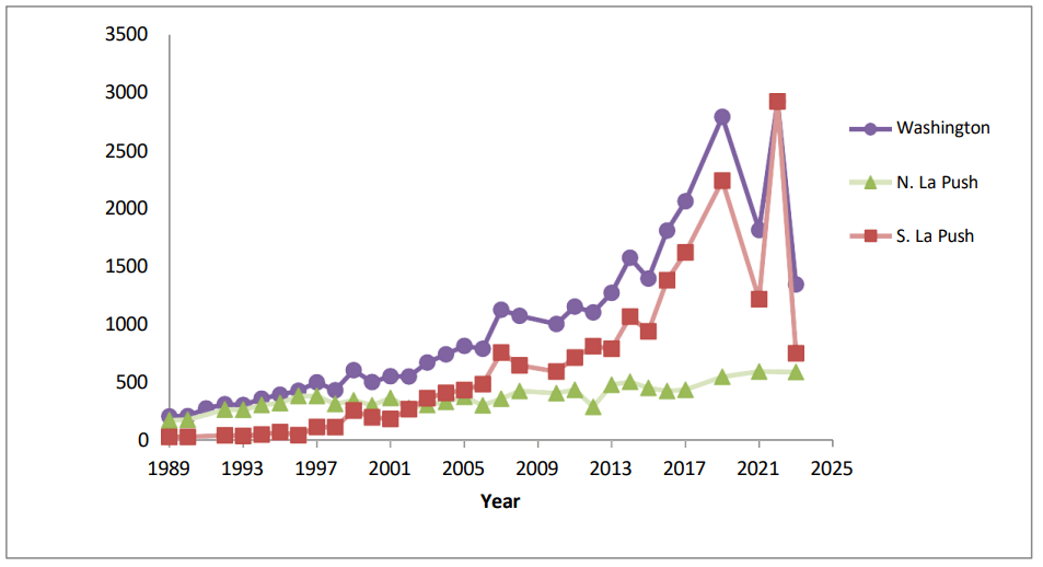 Figure Credit: Washington Fish and Wildlife Office, 2023 Survey of the Sea Otter Population in Washington State. Growth patterns for Washington’s sea otter population from 1989 to 2023.